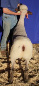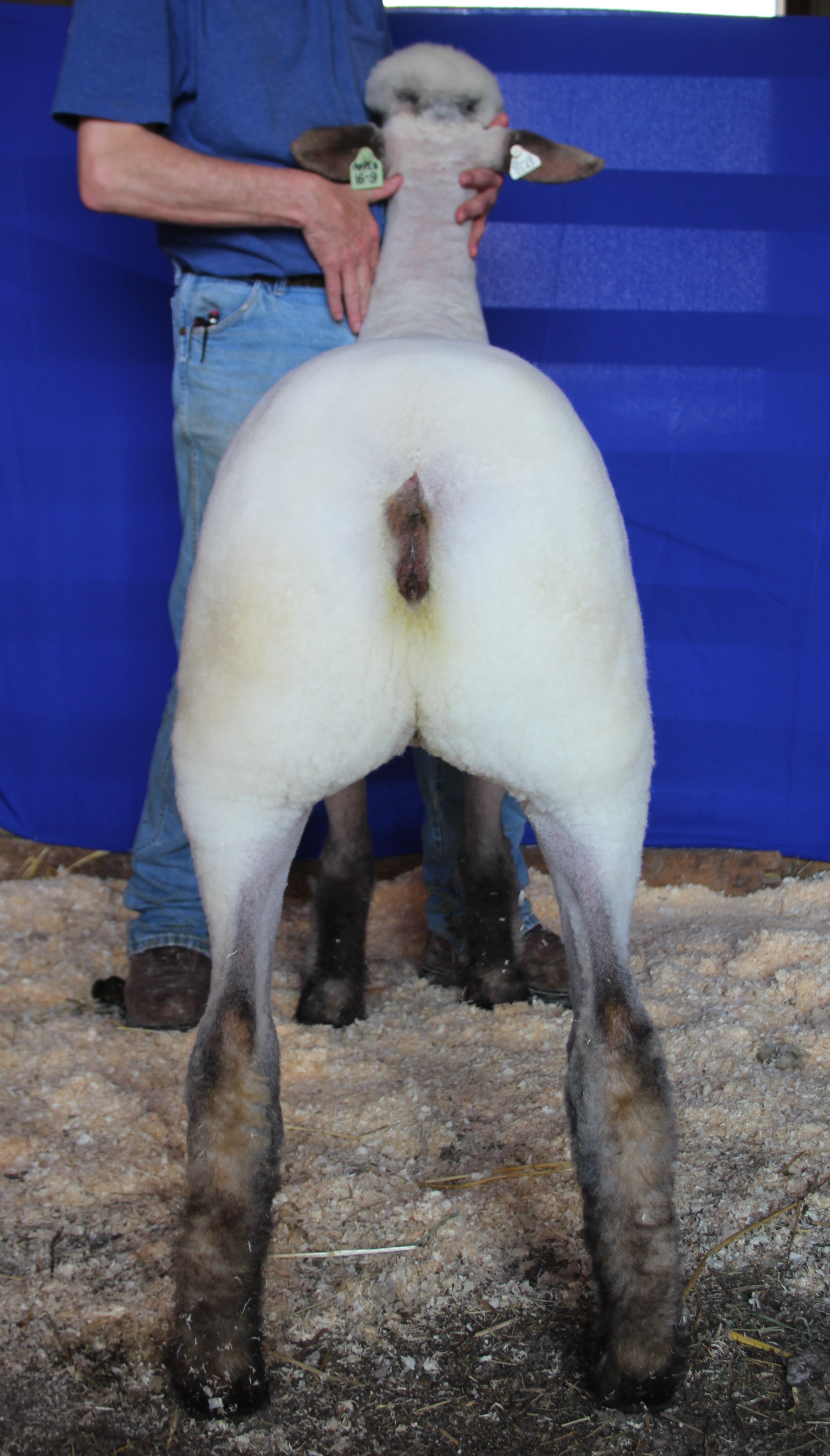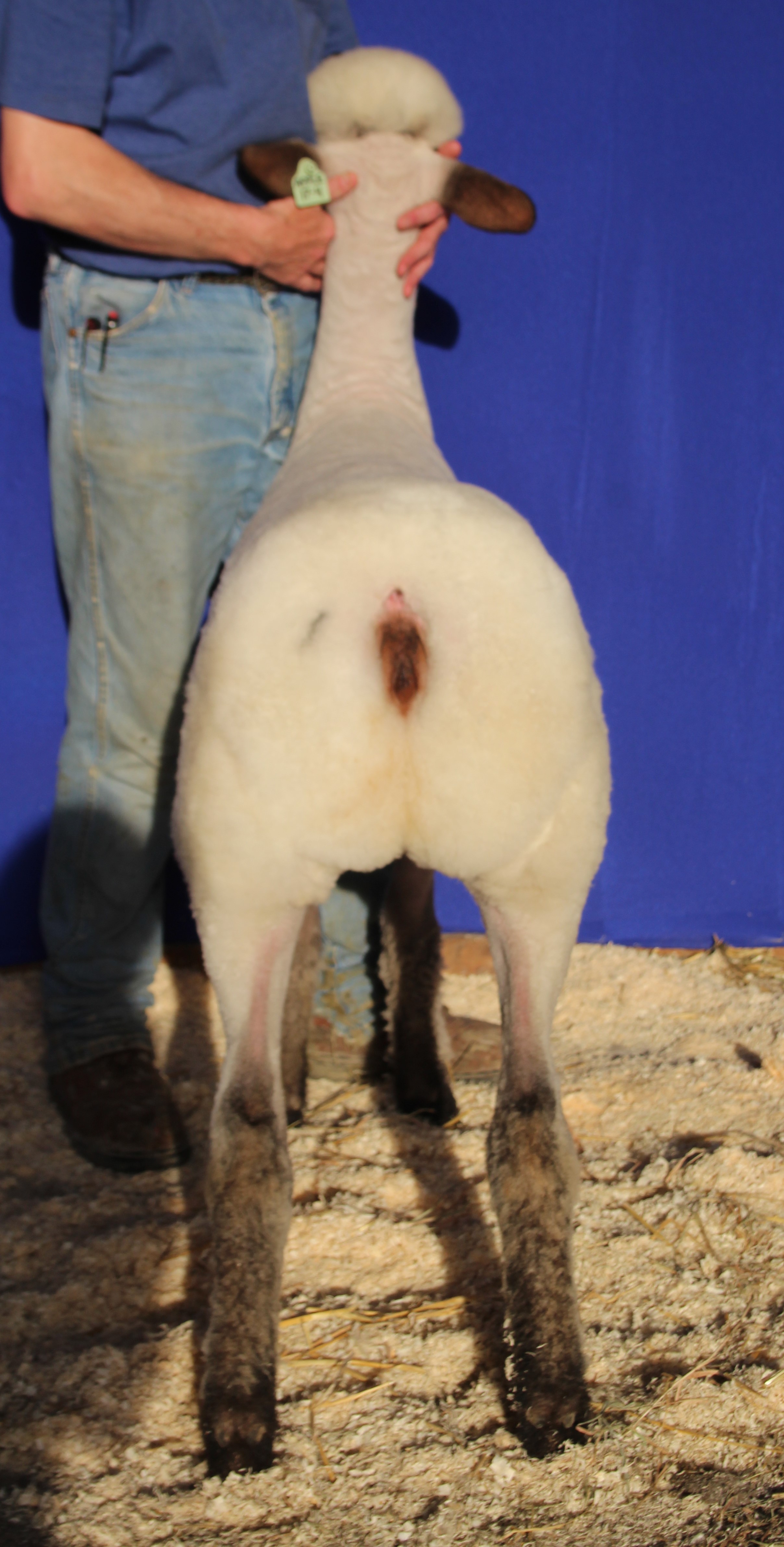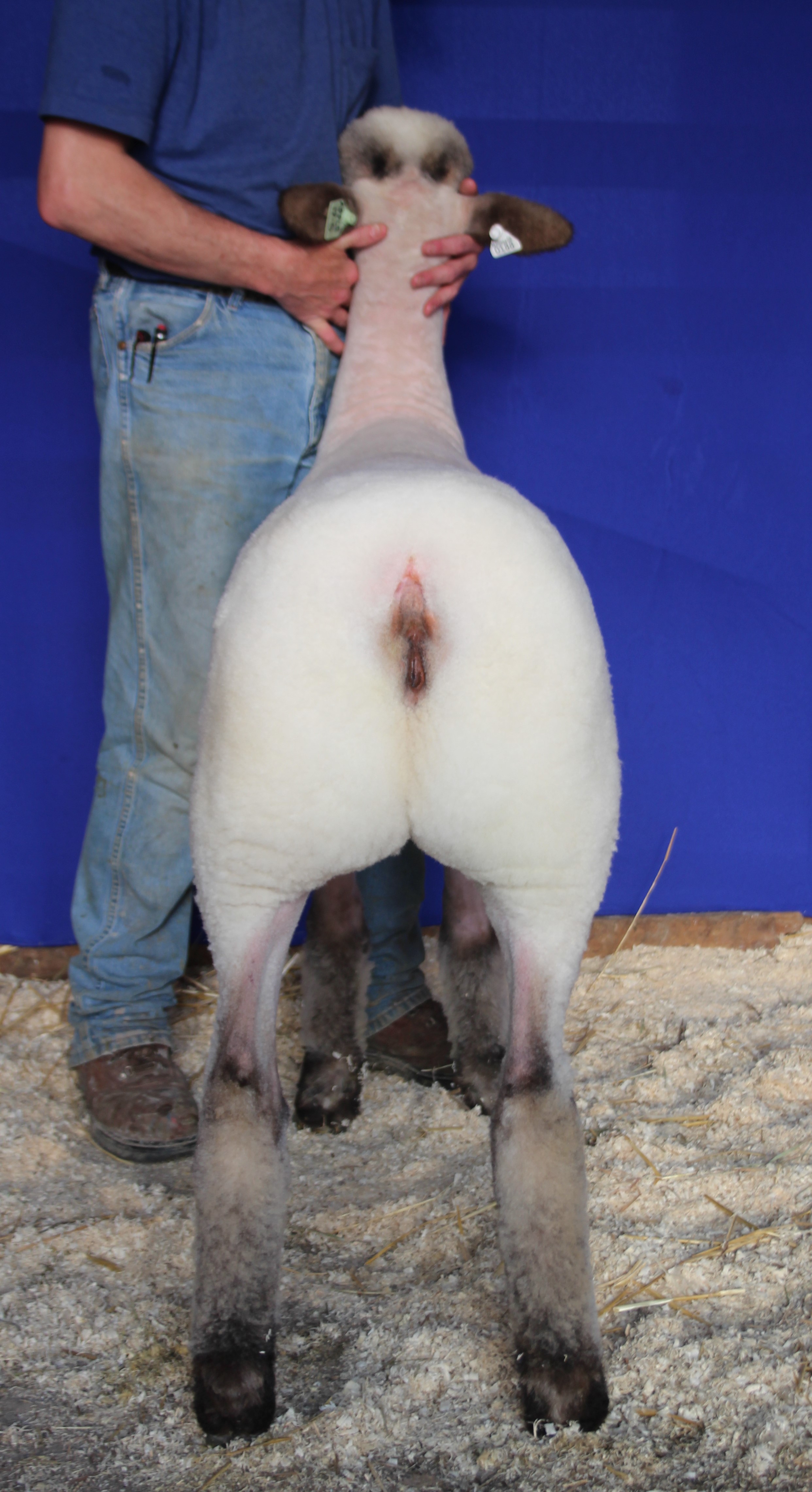 Sired by WWSF 18-13321A “Pressure”, a full brother to WWSF 17-13321A “Precious”, two-time National Grand Champion Ewe. Her dam is a Perzee 1725 “Cliff Horde” daughter giving us a first look at the succession mating between our two top stud rams. This ewe lamb is still really green and wasn’t perfectly cooperative during the photo session but she should be a solid, productive female.