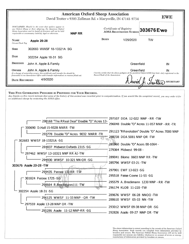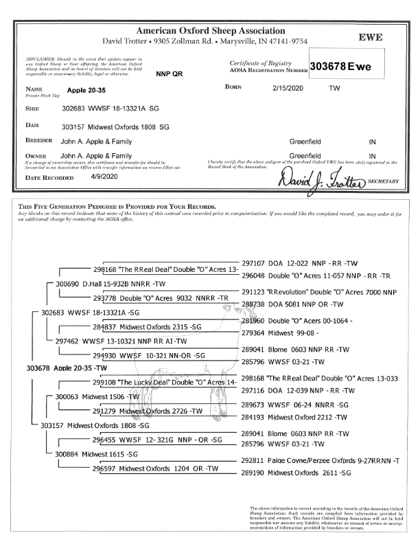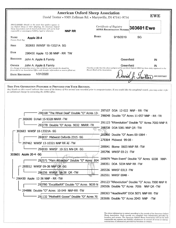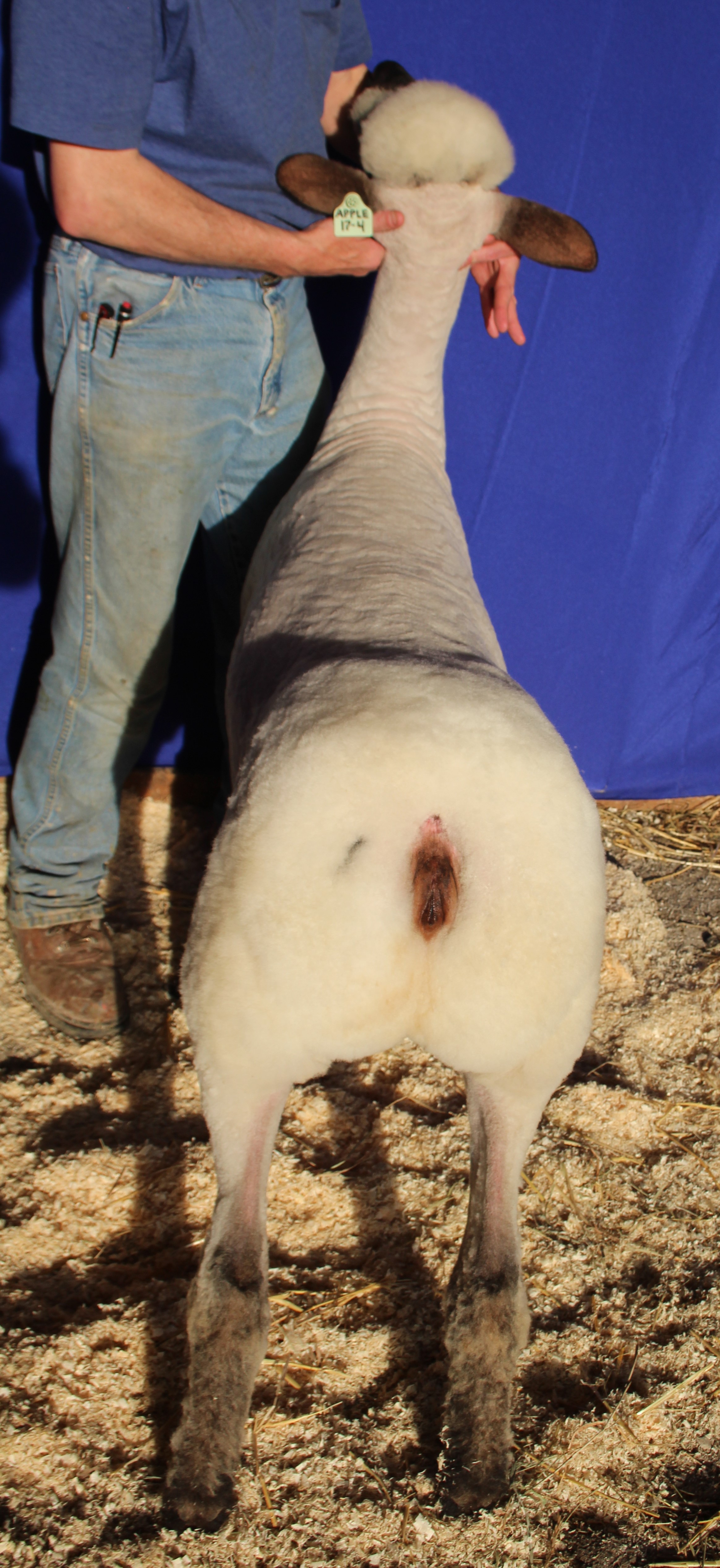 She is a full sister to our Apple 15-7 stud sire. She too boasts WWSF “Gus” lineage on the top side which includes WWSF “Hot Shot” and Midwest “Perfect Image” genetics. Her maternal line traces back to DOA’s “Main Event”, “Main Attraction”, “ExcalibeRR”, “RRevolution”, MotheRR Goose”and “HeadlineRR”. A very solid ewe lamb prospect with an RR rating.